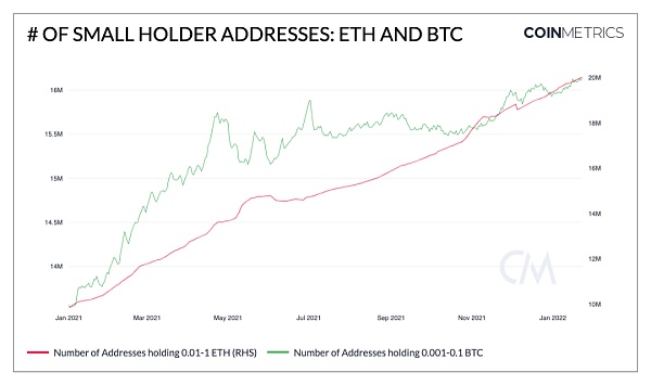 持有相对少量比特币和以太坊的地址数量继续增加。随着与NFT相关的活动在网络上继续激增,持有0.01到1个ETH的地址数最近超过了2000万个,这是2021年1月1日数据(980万个)的两倍多。同样,持有0.001到0.1BTC的地址也在持续增加。