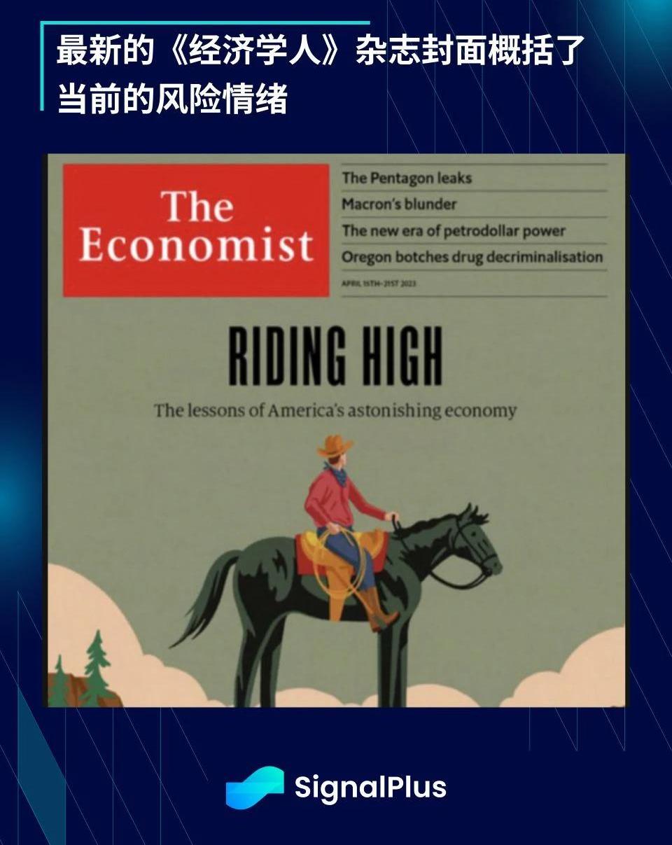 由于经济数据结果和强劲的股市情绪,美联储利率预期回升至一个月内的最高水平,5月加息的可能性升至80%以上,市场对于年底前累计降息的预期不到50个基点,相比于3月初的80多个基点已经大幅下降。虽然银行业动荡仍在,且市场对于即将到来的衰退感到担忧,但实际经济情况表明,通胀仍高于美联储目标,就业和工资增长仍然紧绷,整体经济增长仍高于趋势水平,银行业风险进一步蔓延的可能性也正在降低。也许最能概括当前这种情绪的是近期《经济学人》杂志封面,美国经济仍继续攀登忧虑之墙,股市仍背离市场共识,持续上涨。