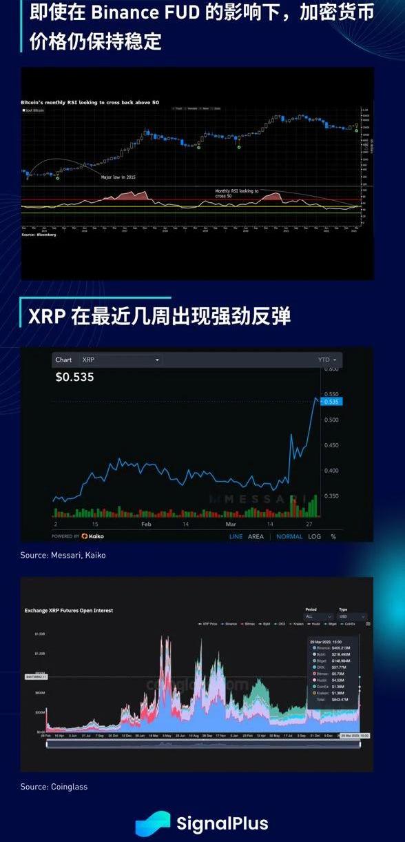 -即使在BinanceFUD的影响下,加密货币价格仍保持稳定,BTC有望在未来几周挑战3万美元,其他代币也出现强劲反弹,特别是XRP上涨4.4%,原因是美国SEC可能会对Ripple作出友好裁决,将其代币归类为商品(commodity)。目前价格走势看起来颇具建设性,RSI自2022年中以来首次突破50,不过尽管现货价格最近走高,隐含波动率仍然相对低迷。