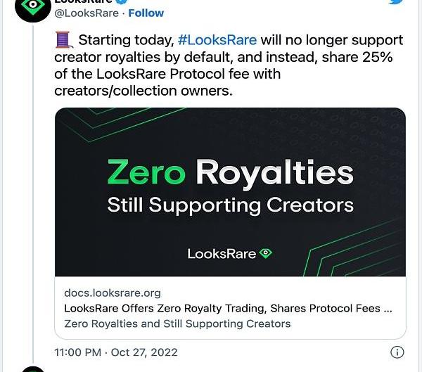 NFT平台LooksRare宣布不强制用户在购买NFT时支付创作者版税。该措施逐渐在NFT平台上流传。其中NFT平台X2Y2位比较早的支持了不强制版税的措施,用户可在每24小时时间轴内投票决定该NFT项目收取的版税数额。LooksRare本次的措施将用户支付的版税转换成了买卖中协议费用,该措施将增加平台的流动性,且大大提升了LooksRare在同类市场的竞争力。