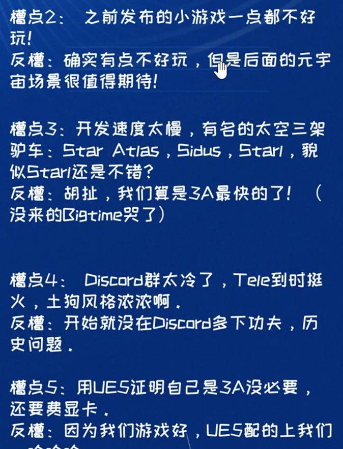 项目方公布的新闻说直接是从做COC的SuperCell公司挖的人,是一款太空类的COC风格游戏。其实今年大家一听到太空类链游就头大,开发进度老是跳票,我们瓜田社区把去年三个最火的太空类MMORPG游戏戏称为“太空三架驴车”,还请了其中一家来了space开脱口秀大会,一边哈哈哈一边喷喷喷,过程如下图所示: