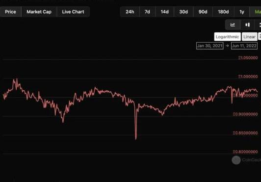 但是,根据官方介绍的机制,stETH是作为流动性补偿方案提供给质押者的。随着合并日期的临近,stETH的价格应该与ETH相等。但是最近发现,Curve上ETH-stETH流动性池的价格脱钩恶化了。一个stETH只能兑换0.954ETH左右,池中的比例也变得不平衡,stETH的比例接近80%。