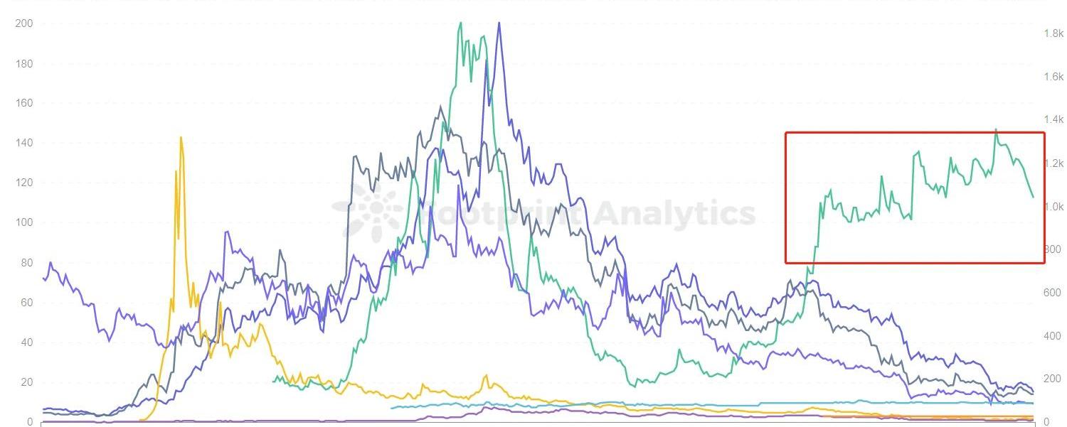 而GameFi其他的数据表现也不尽人意,FootprintAnalytics显示: