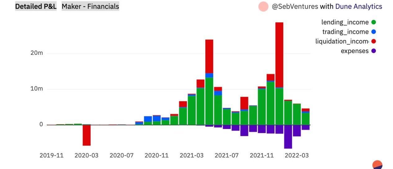 我们刚刚开始探索加密货币可能实现的透明度和实时披露。在Finance1.0中,披露被隐藏在季度报告和其他报告。在加密货币中,重要金融系统的损益是可以实时监察的——例如下图,表示的是MakerDAO在Dune中的实时损益。