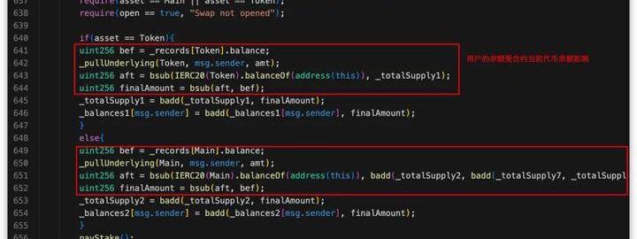 查看FEGexPRO合约,我们能看到depositInternal()函数和swapToSwap()函数的具体逻辑。其中depositInternal()函数进行质押,用户的余额受到合约当前代币余额的影响,第一次攻击者正常质押后balance也正常增加,而由于当前合约代币余额没变,后面的质押只需要传入最小值调用即可。