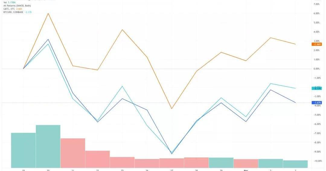 第二日,BITO交易金额继续创下新高,达到12.94亿,两日涨幅共5.87%。截止11月3日收盘,BITO价格为40.4美元,自19日开盘以来下跌了3.67%。同时期,比特币现货跌幅为2.13%,略小于BITO跌幅。不过,由于BITO跟踪的是近月比特币期货,而随着近月到期日临近,期货价格会逐渐收敛至现价,因此这段时间收益率略低于比特币现货是可以理解的。比较BITO和GBTC的溢价走势会发现,至少在价格跟踪方面BITO的效果更明显。