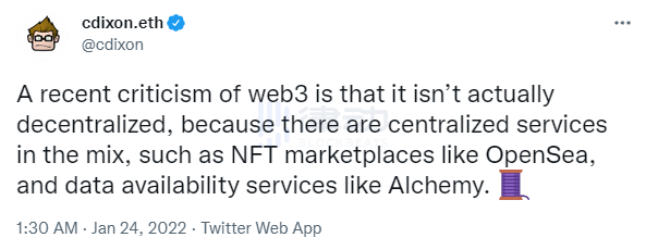 律动 BlockBeats 消息,1 月 24 日,a16z 合伙人 Chris Dixon 在社交媒体上发文表示,市场上对 Web 3 存在不少批评是因为许多人认为 Web 3 其实并不是去中心化的,因为许多 Web 3 应用混合了中心化服务,比如 Opensea NFT 市场,以及 Alchemy 数据可用性服务。但是,这种批评其实基于了对「去中心化」的错误理解。