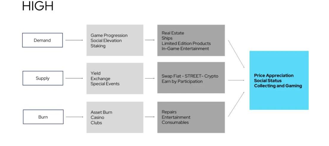 STREET将用于游戏中的日常购买,从食品和饮料,到游戏中的数字装备。虽然HIGH的上限是1亿,并有一个通货紧缩机制,但STREET是通货膨胀的,没有上限,随着越来越多的玩家进入元宇宙世界,STREET发行量将逐渐膨胀。