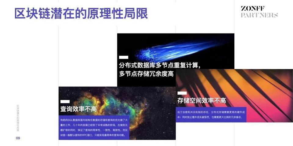 当然单纯使用区块链技术也会存在一些原理性的局限,还需要更多分布式网络基础设施的创新,比如分布式数据库以防止数据丢失和冗余和多节点备份的成本较高的问题,每一次的状态修改需要密码学的共识过程,这也会在一定程度上影响存储效率,第三是查询效率不高,传统SQL数据库面向结构化存储和查询做了大量优化,而分布式存储在便捷性上还无法达到。