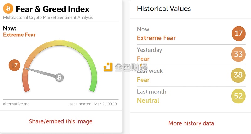 金色财经报道,Alternative数据显示,今日恐慌与贪婪指数为17(昨日为33),恐慌程度大幅上升,等级由恐慌转为极度恐慌。 注:恐慌指数阈值为0-100,包含指标:波动性(25%)+市场交易量(25%)+社交媒体热度(15%)+市场调查(15%)+比特币在整个市场中的比例(10%)+谷歌热词分析(10%)。