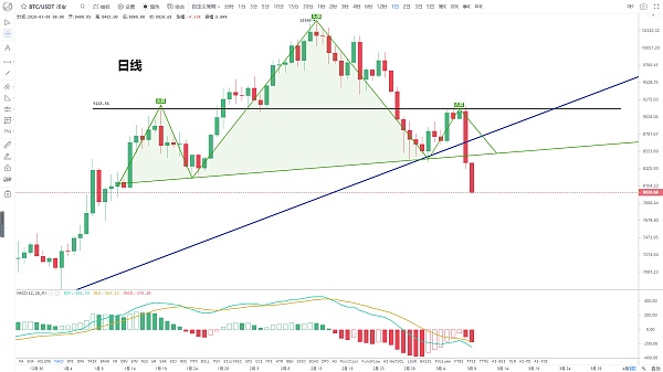 前面9150-9200之间为日线潜在头肩顶的右肩顶部区域,只有放量站上才能进一步上攻,然而反弹量能一直跟不上,向上动能丧失,多次试探压力无果后,这两天掉头向下,并跌破8500颈线支撑,日线级别头肩顶形态确立,这是一种阶段看空形态,而后价格再次开启下杀模式,一路跌至目前8000美元附近,短短两天时间跌幅超过1000美元,回调力度比较大,并且指标上,日线MACD即将金叉之际,又恢复到向下发散的状态,形成金叉不金,下跌阴线反包前面反弹的阳线,也意味着前面的反弹是主力的诱多,目前盘面还未企稳,短期内可能还有惯性下跌,目前还不是抄底介入的时机。