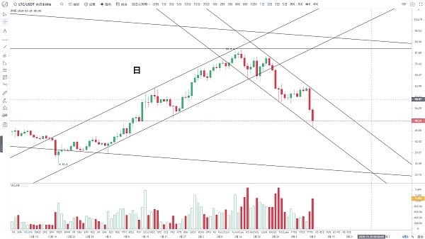跟随大盘下跌,两天跌幅超过20%,同样下砸带量,恐慌盘涌出,部分风险得到释放,目前价格基本回落至年初起涨位置,今日最低插针至趋势线再小幅回升,显示有抄底资金进场,短线超卖严重,止跌企稳后,近期同样有反弹需求,后面只有走出下降通道,才能终止近期的弱势局面,支撑45美元,压力56美元。