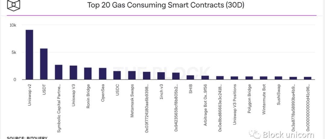 去中心化交换代表了以太坊上最广泛的手续费消耗。根据TheBlock的统计,与代币交换相关的合约是消耗区块链资源最多的合约之一。
