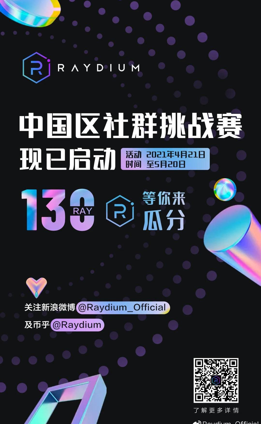 4月21日起至5月20日,立刻参与Raydium中国区社群挑战赛,赢取积分,晋级挑战赛排行榜!赢得奖励!