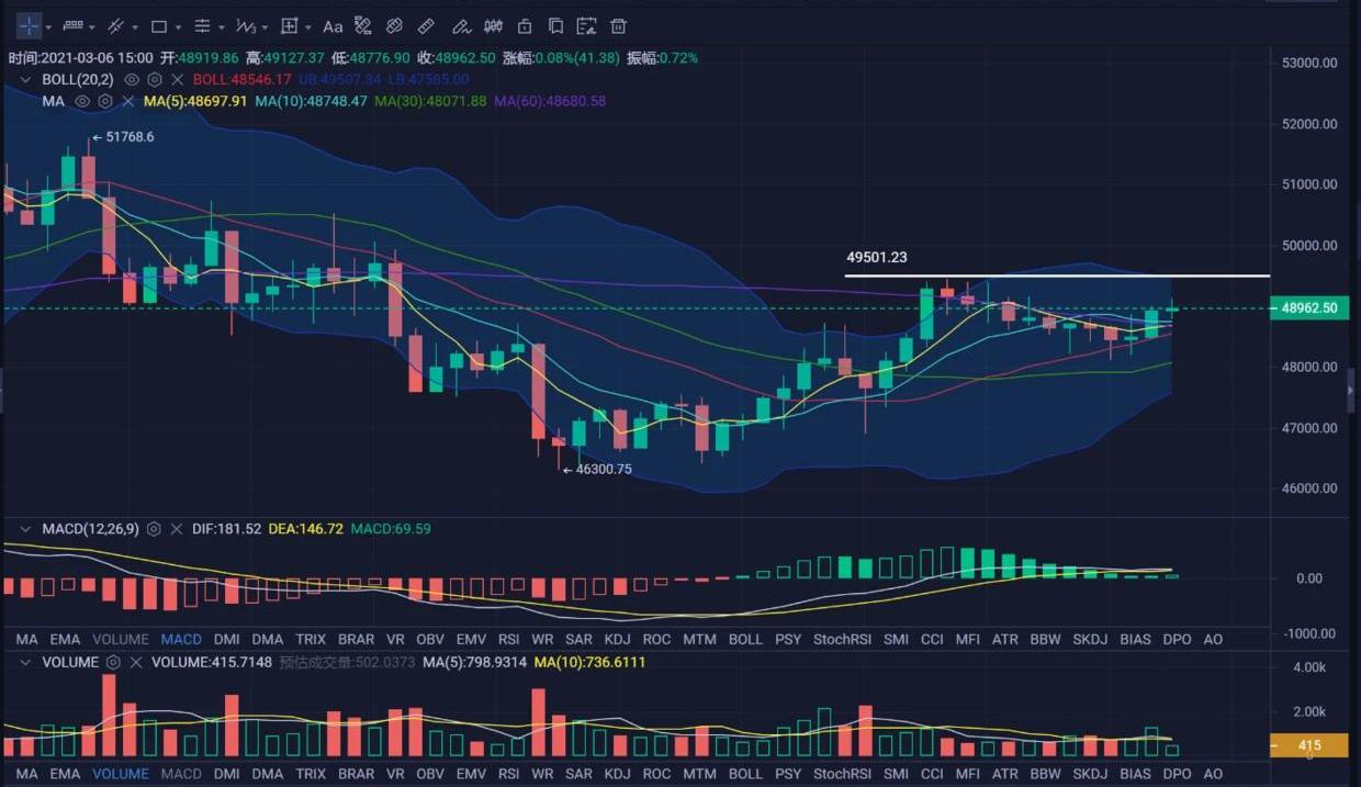 行情今日先是向下回踩低点46900后,触底反弹,迎来了多方的强势;小时图中,接连三根阳K线,成功地将币价拉回至47000上方运行,并达到高点49444点位;这一波的拉升让多头的激情再次燃起,可是行情并未再次向上展开攻势,而是在48500一线震荡;从当前的走势来看,行情后期若是可以真正的企稳48500点位,则上方的50000关口便可将其破位,到其上方运行。