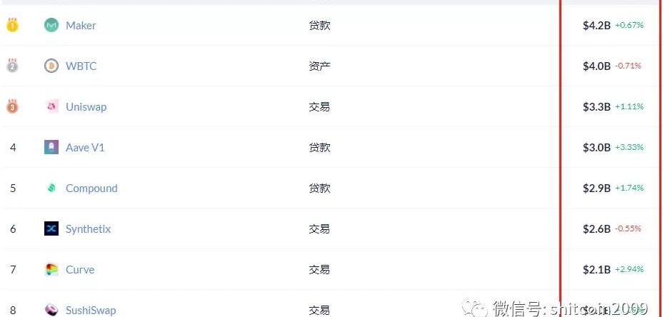 排名前8的,锁仓的金额都已经达到20亿美金了,排名第一的Mkr已经锁仓高达42亿美金了。
