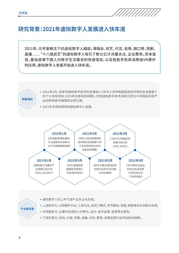 报告指出,2021年元宇宙概念兴起,叠加疫情下国人对虚拟内容需求增加、消费级VR硬件快速发展,虚拟数字人发展进入快车道。报告从未来媒体形态和服务模式重新定义了“虚拟数字人”:计算机图形学、语音合成技术、深度学习、类脑科学、生物科技、计算科学等聚合科技(Converging Technologies)带来语义传播与无障碍传播的新空间,由此诞生的虚拟数字人将以新媒介角色,广泛应用在元宇宙新生态中,担任着信息制造、传递的责任,是元宇宙中“人”与“人”、“人”与事物或事物与事物之间产生联系或发生孪生关系的新介质。