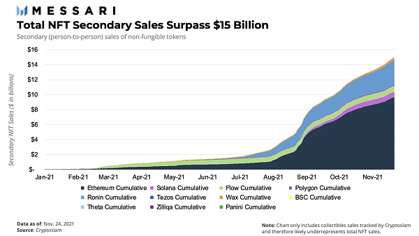 Messari的数据显示,包括12月在内的NFT二级市场达到了150亿美元的规模。Cryptoslate估计,目前NFT的市值为376.5亿美元。