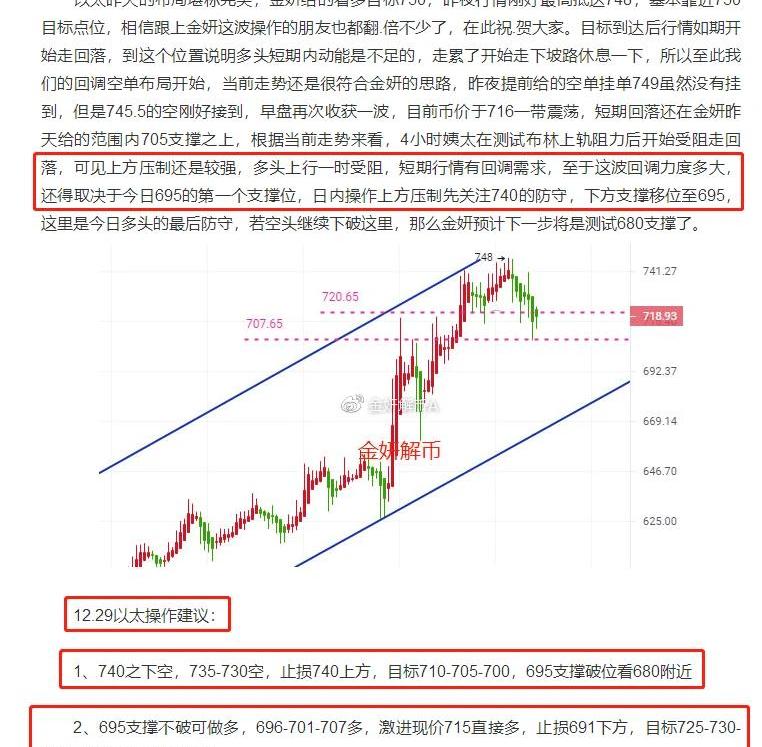 以太方面,关注金妍的粉丝应该都知道,这两天金妍的以太布局一直都是在580-750区间内操作,而昨日分析里也是刚好把握到多空无缝衔接,给的740之下空,695企稳多,看看昨天的盘面走势点位进出场基本都很接近。今日以太受大饼影响也跟着插针,这让原本就不稳定的以太更加动荡了,早盘价格再次冲高到747附近受阻,可见上方750关口压制强势,目前以太还在过山车里面。