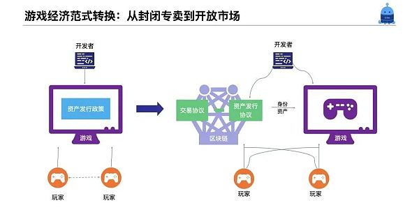 游戏资产发行协议放到了公共区块链上之后,开发者也不能够轻易改动协议。这些游戏内的资产不管是像金币这样的可互换资产,还是像道具、土地这样不可互换的资产,都会变成链上的标准格式的通证。那么资产发行在链上,就可以使用链上的任何协议进行交易。也就是说所有的游戏资产变成了开放的、巨大的、统一的加密资产市场的一部分。