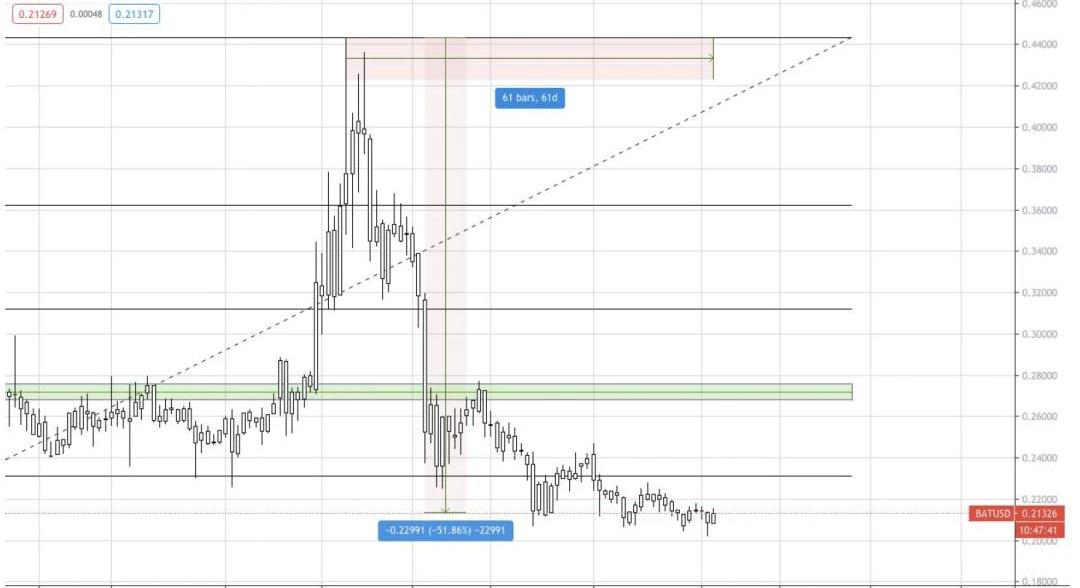 在盘整之后,出现了一段时间的重大损失。亏损之前,出现了从0.24美元到0.42美元的非凡走势。这导致BAT的价格在半个月内几乎上涨了100%。在此之前,BAT与其他市场相比,并没有出现什么惊人的变化,在一个平行的通道内交易,然后是一个横向的时期,然后是突破。