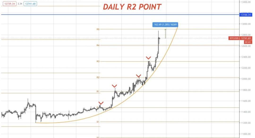 当看1小时图时,很明显,BTC不会收在13500美元以上。这是由于涨势和涨势的角度。超过R5支点的走势是比较少见的。比较大的可能是,BTC回调到12600美元,经过一些小的盘整,然后再向12350美元小幅回调。
