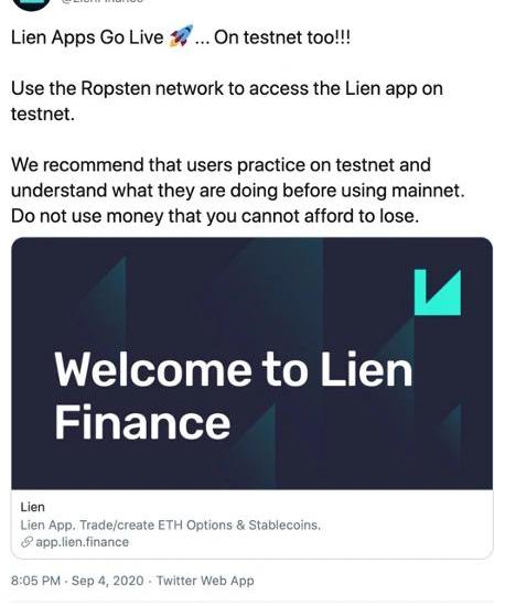1.稳定币协议Lien在以太坊网络上启动,这是基于以太币的无超额抵押稳定币和选择权商品的基础协议。目前,Lien应用程序已通过漏洞测试,还验证了部署到主网的代码是经过审核的代码。