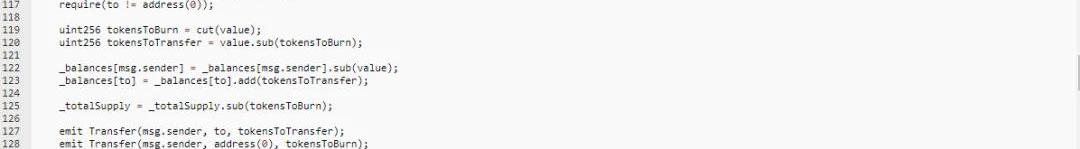 tokensToBurn即为每次交易销毁的值,其销毁数额是转账数额的1/100,如当数值为1e-18时,其销毁值也是1e-18。销毁值的计算源码如下图所示: