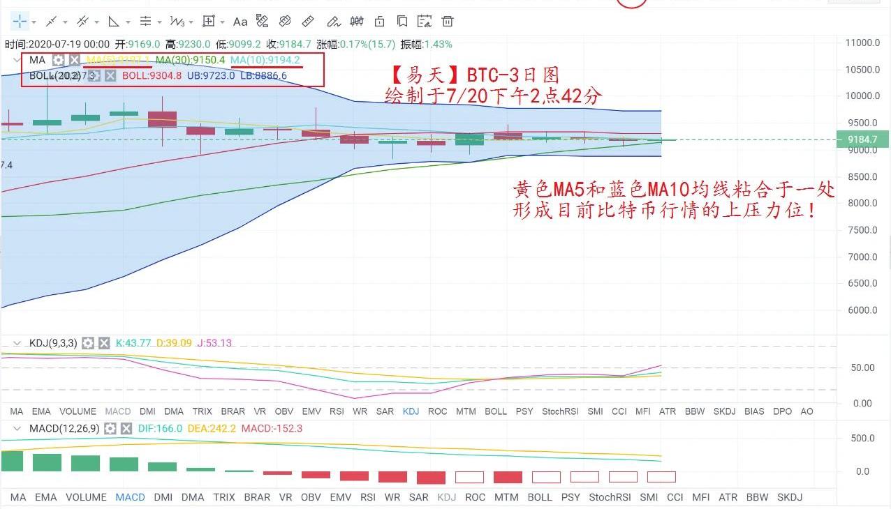 再从3日图来分析一下,从图中可以看出,BOLL通道已经平行运行很长时间了,绿色MA30均线逐渐上行,来到比特币行情下方形成支撑位;上方黄色MA5和MA10均线已经粘合运行一处,形成目前行情的上方压力位!