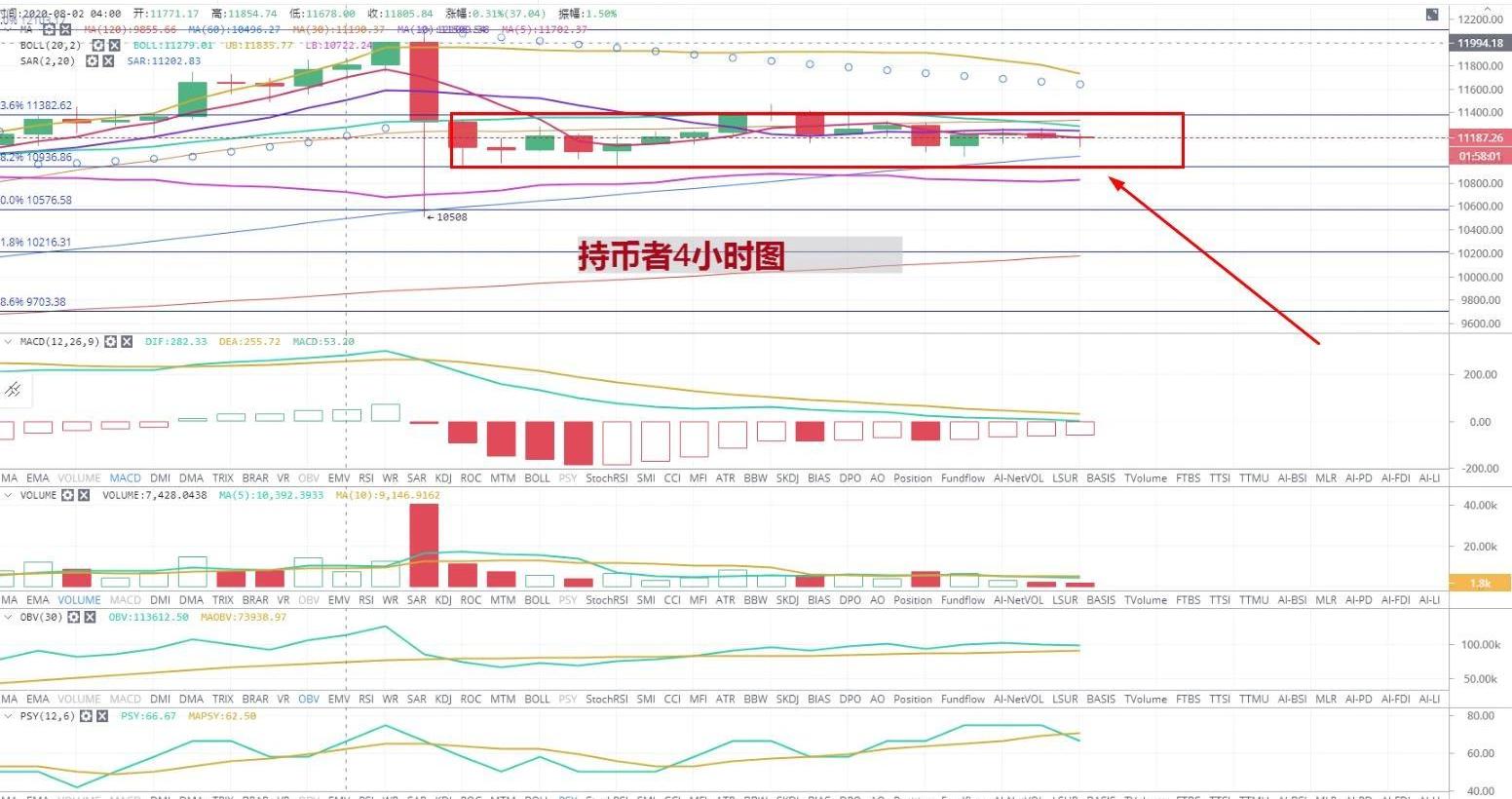 在持币者4小时图中,近2天币价一直处于低位震荡,市场情绪和成交量萎缩,目前布林带在逐渐收口。目前指标中空头能量在初步释放,可以在持币者图中MA60关口均线和10936.86一线的支撑位置。