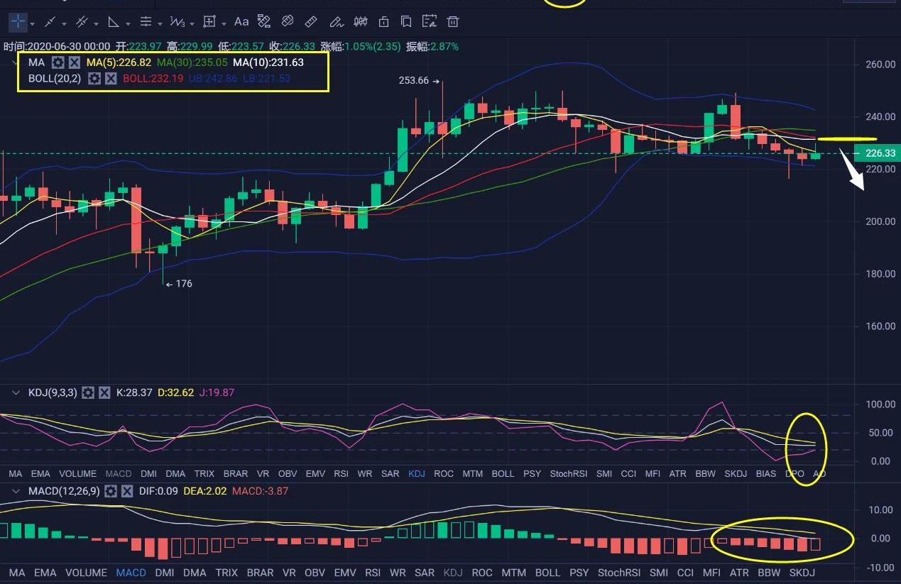 从日线级别来分析,BOLL通道向下运行,白色MA10日均线和BOLL中轨粘合一处形成以太坊行情上方强压力位,黄色MA5日均线已经下穿中轨和各均线系统对目前行情进行压制;币价昨日日线继续收阴,整体走势还是维持在日线BOLL通道中下轨当中。早间开盘多头首先发起一波强势上攻,直接突破MA5日均线阻力试探到日线BOLL中轨阻力位;下方KDJ指标紫线已经抬头向上,有形成金叉迹象,能量指标MACD快慢线死叉继续向下运行位于零轴附近,空头能量持续释放中;综合来看,易天(aphz8705)认为目前的趋势处于一个小区间的震荡期,日内操作建议高空低多。