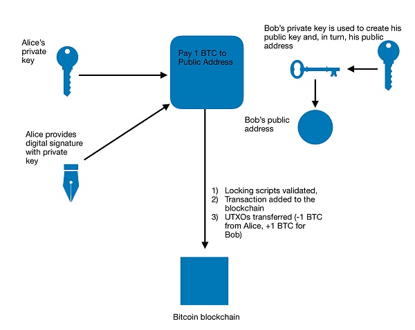 Alice想付给Bob 1个BTC,为此,她使用Bob的公共地址创建了一笔交易。为了转移比特币,Alice提供了她的数字签名(由私钥和交易数据历史产生),以证明她在UTXO集中拥有至少1个BTC,同时没有泄露她的私钥。