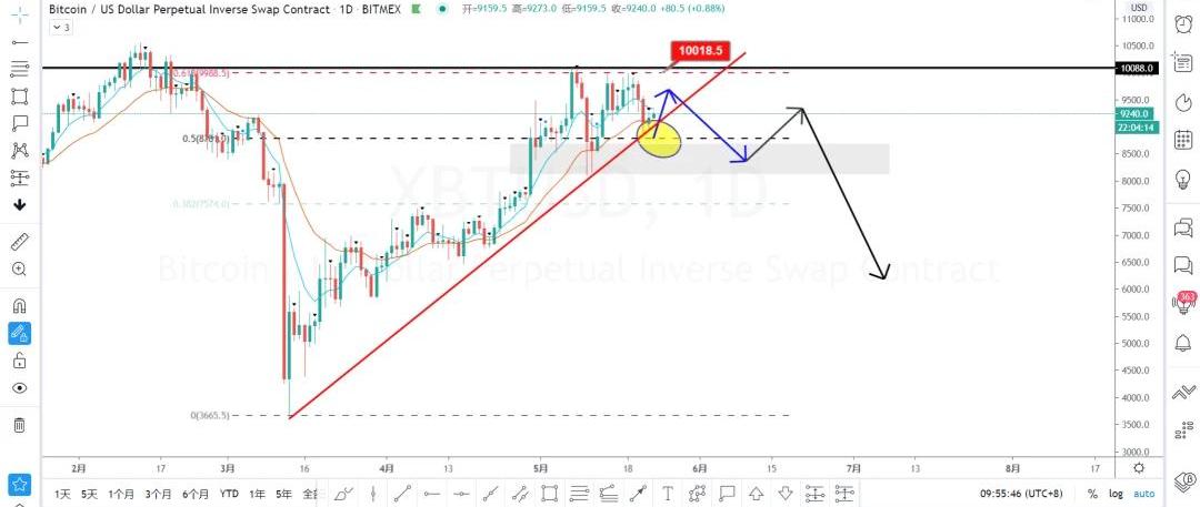 1900/1/1 0:00:00比特币测试9500美金的压力后,并未突破,选择往下测试支撑,跌破上涨趋势线后,开启反抽。接下来重点关注反抽的力度,观察9300美金附近的压力,如果能突破,将再度回到上涨趋势线中;如果失败,那么将.