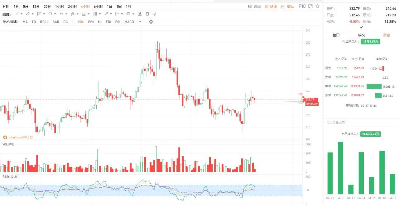 ETH止跌后率先启动上行,四小时K线低位锤子形后涨幅较大,直接站上前期高位。短时观察后续的量能支撑,大方向上还是看BTC的选择。