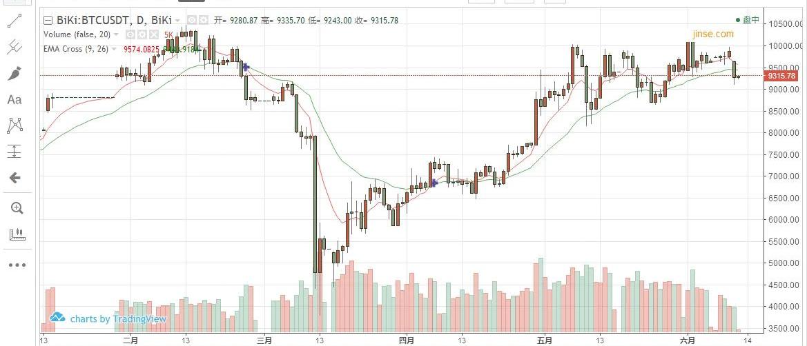 BTC昨日在冲击一万大关受阻后,日内呈震荡下行的趋势在运行,要是仅仅是回调蓄力那也能接受,但是随着晚间的一轮跳水,多头此轮攻势可以说已经直接被腰斩了,日内从最高点9980一路下探至9100附近,跌幅近900个点,这一刀砍的有点狠;在探至低点9100一线后币价也是稍作反弹,目前位于9350附近调整。