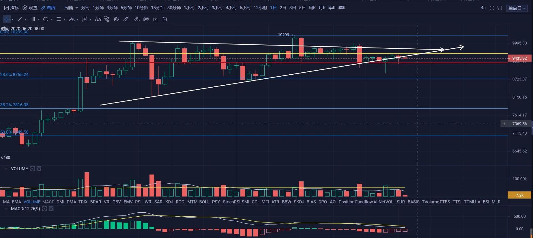 目前的量能基本上已经到了地量,变盘估计就在近两日。我个人的看法是偏空的,但一般下跌之前,庄家往往会来一个假突破,可以寻找类似的“天地针”进行操作。下方支撑的位置基本上在8600美金附近,而上方的压力位则是9600—9800美金附近。
