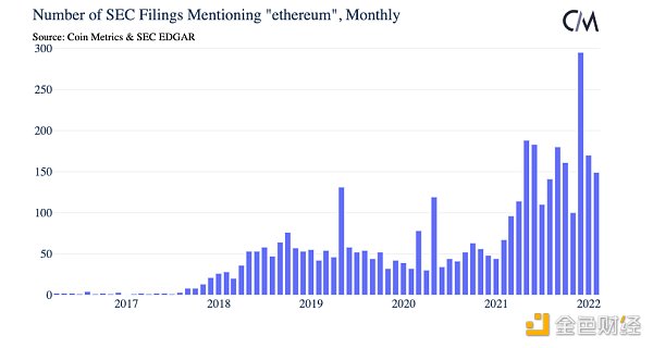 近日链上数据服务商Coin?Metrics通过检索美国SEC数百万文件中提及加密货币相关术语,研究了美国实体接受加密货币的演变趋势。