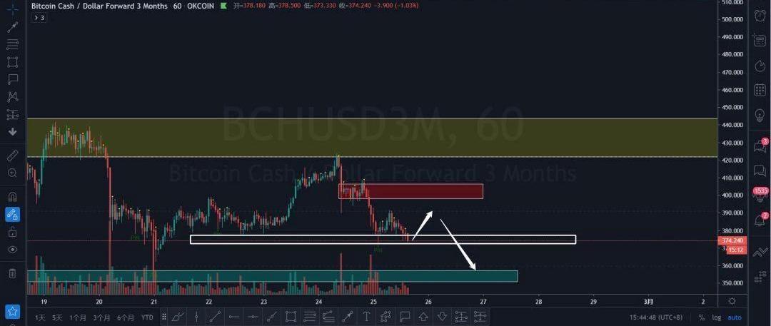 2.25策略:目前在测试前方小V反的颈线,看量能是大概率要破,如果给到反抽机会那么介入做空,下方距离关键支撑还有一些空间,关键压力:390、405,关键支撑:359、333