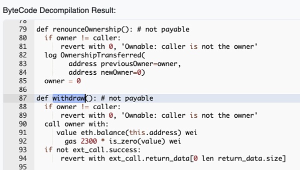 1. 合约的所有者部署了一个未经认证的合约,其中函数 withdraw 只允许所有者提取所有BNB(eth.balance(this.address) wei)到所有者的地址。