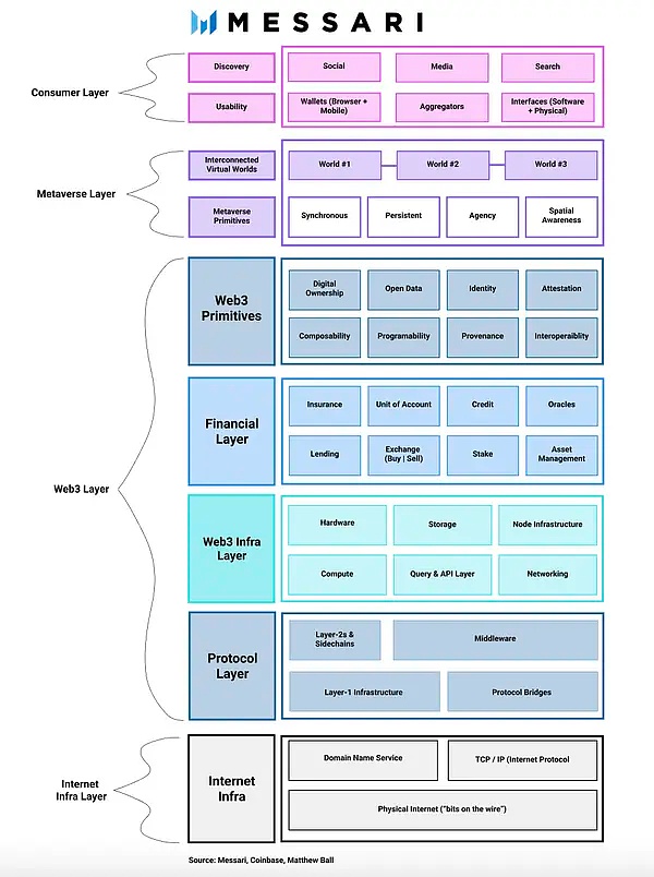 今天,元宇宙特攻队翻译一份 Mesarri Pro 报告,看看作者 Mason Nystrom 如何用简洁的层级堆栈图介绍 Web3 在元宇宙中的角色和作用。