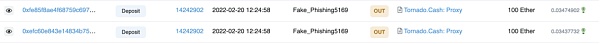 之后,该黑客将获得的ETH通过不同的额度转入混币平台Tornado.cash,约为1115个ETH。交易截图如下: