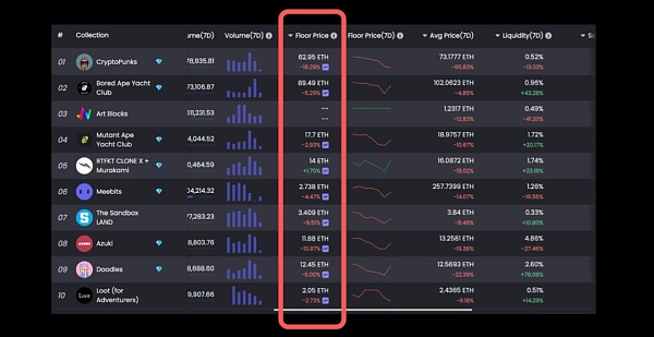 这一趋势表明,尽管一些NFT项目在此期间流动性较低,但其他项目的表现在很大程度上优于NFT。Doodles的流动性略低于1%,几乎是第二名BAYC的两倍。还有一个有趣的现象:当均价下跌,地板价达到9ETH时,被交易最多的不是地板价NFT,而是价格为10ETH甚至12、14、16ETH的一些相对更好看的NFT。