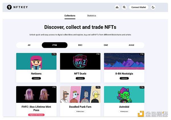 NFTKEY 是一个去中心化的非托管 NFT 市场, 2021 年 3 月 26 日启动,支持以太坊、币安智能链、Fantom、Avalanche 和 Harmony 上NFT 上架、拍卖、交易。NFTKEY 收取 2% 的交易费用,默认的创作者版税为 2%,但创作者可以在 0% 到 8% 的范围内设定。