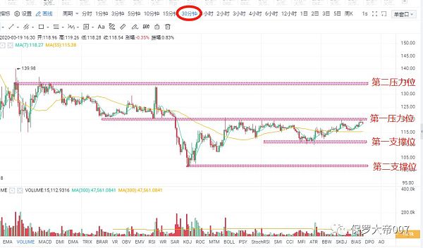 总体走势稍弱与大饼,短周期和大饼一样震荡行情,无聊的行情。30分钟小周期走势,和大饼一样的三角整理。第一压力位120美元,第二压力位135美元,第一支撑位110美元,第二支撑位100美元。