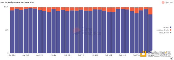 让我们再来仔细看看Matcha和Metamask的用户到底有什么不同。Matcha的的交易量主要由巨鲸驱动的(定义巨鲸为日均交易量超过$100k)。同时,Metamask对巨鲸的依赖性不高,主要的交易量来源于中小型的散户。