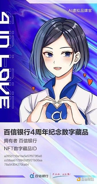 2021年11月18日,百信银行在成立4周年之际发行了行业首个NFT数字藏品——“4 in love”,据介绍,该数字藏品基于区块链技术发行,于12月27日正式入驻百度希壤App数字艺术品展区,这是百信银行首次亮相元宇宙大会,也是面向元宇宙数字资产领域的一次创造性尝试。与百信银行一道,工商银行河北雄安分行同样作为首批金融机构“入驻”希壤。