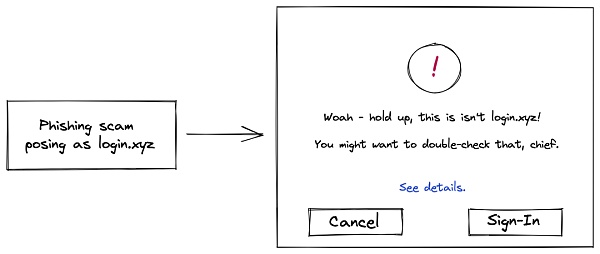 该规范还为钱包引入了额外的安全要求,例如引入域绑定以防止钓鱼攻击;引入 nonces 以防止重放攻击,用户在整个过程中得到了进一步的保护。比如,如果钱包发现一个有效的 SIWE 信息,但是用户正在对 example.com 进行签名 (但实际上是在 exampie.com),钱包可以警告用户该情况: