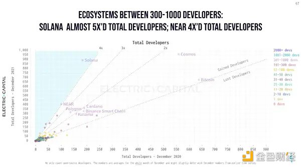 2021年,NEAR上的开发人员快速增长,NEAR是有史以来增长速度第二快的协议,仅次于BNB。在2021年,NEAR的开发人员总数增长了4倍,仅次于Solana(见下图)。2022年继续增长,1月和2月又增加了500多名活跃开发者。