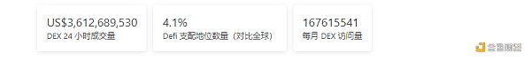 2.过去24小时去中心化交易所的交易量:36.12亿美元