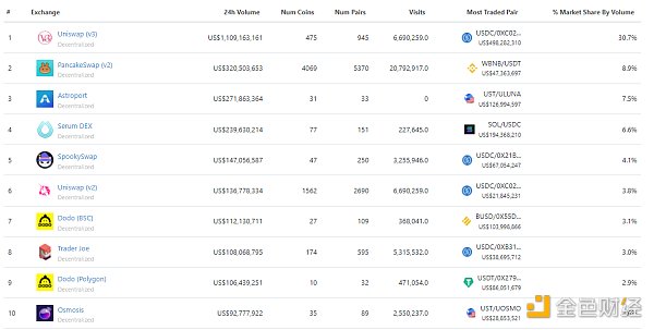 过去24小时去中心化交易所的交易量 数据来源:coingecko